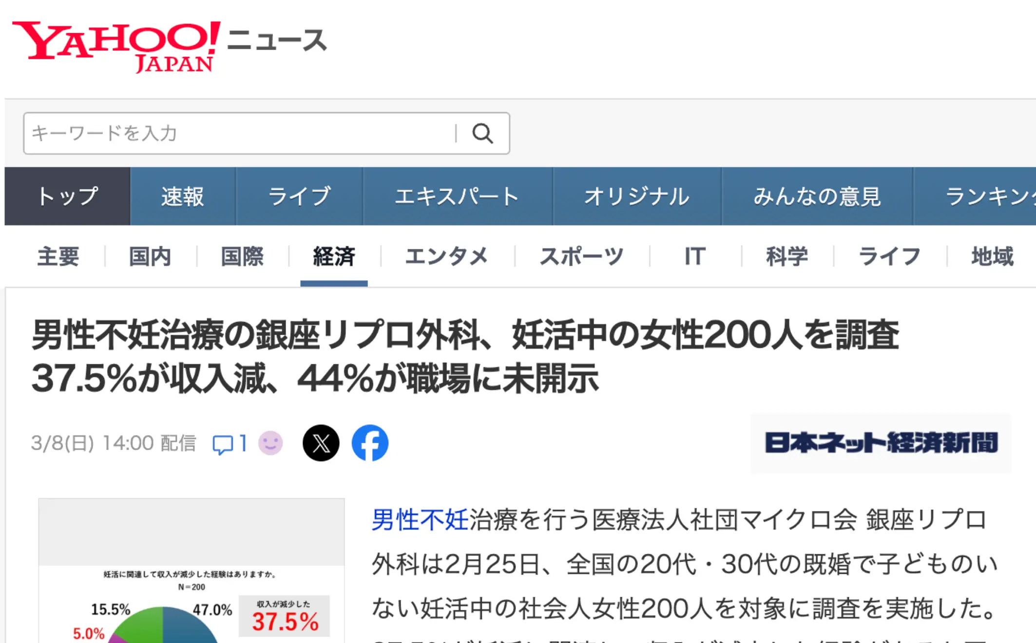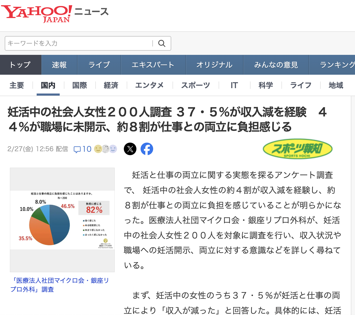 妊活中の社会人女性200人調査 37・5%が収入減を経験 44%が職場に未開示、約8割が仕事との両立に負担感じる、というタイトルでYahoo!ニュースに掲載されました。ぜひお読みください。