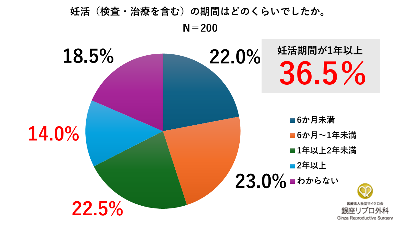 妊活の期間については、「6か月未満」が22.0%、「6か月~1年未満」が23.0%、「1年以上2年未満」が22.5%、「2年以上」が14.0%でした。