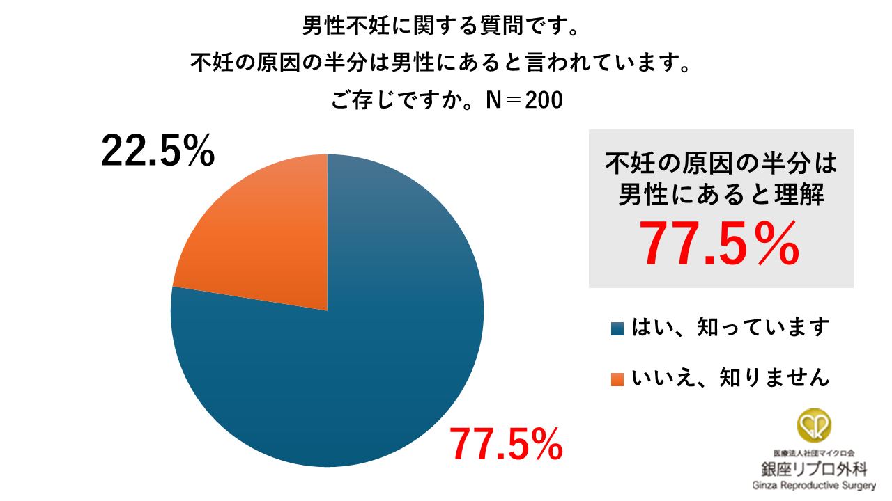 男性不妊に関する認知については、「不妊の原因の半分は男性にある」と知っている人は77.5%と一定の認知がありました。